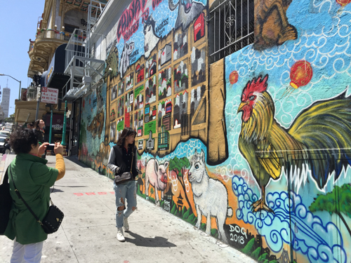 샌프란시스코 클래이 스트릿을 오르다 보면 차이나타운을 한눈에 볼 수 있는 벽화가 있다. 12간지와 함께 차이나타운의 골목 길이 오밀조밀하게 그려져 있어 지나가는 행인의 발길을 붙잡는다. 또 벽화를 찬찬히 들여다보며 차이나타운의 크기에 놀라기도 한다. 사진은 길 가던 관광객들이 벽화 앞에서 기념 촬영을 하고 있다.
