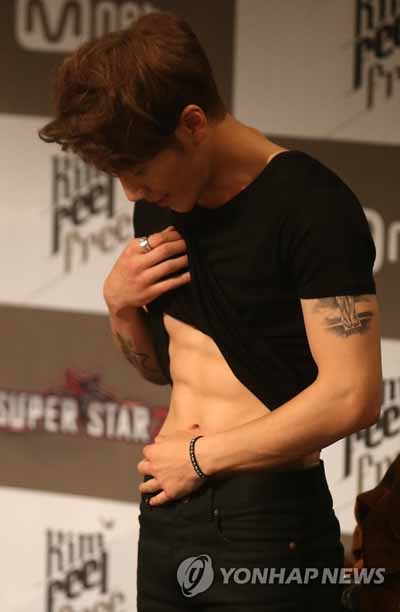 김필, 쇼케이스에서 복근 깜짝 공개 가수 김필이 11일 오전 서울 강남구 신사동 엠큐브에서 열린 첫 번째 미니앨범 '필 프리' 발매 쇼케이스에서 복근을 공개하고 있다. 2015.6.11