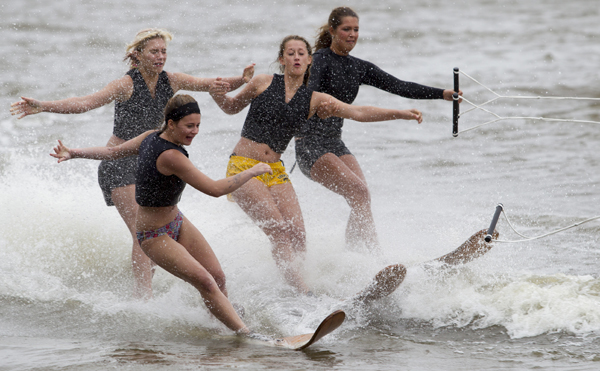 아이오와 벨뷰에서 수상스키팀 멤버들이 지난달 30일 수상스키 연습을 하고 있다.