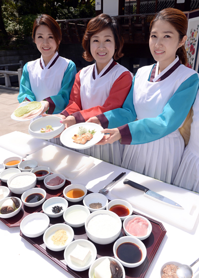 아나운서 박지현(왼쪽부터), 이지연, 김경란이 28일 오전 서울 중구 한국의 집에서 종가음식 조리에 앞서 음식을 들고 기념촬영을 하고 있다.