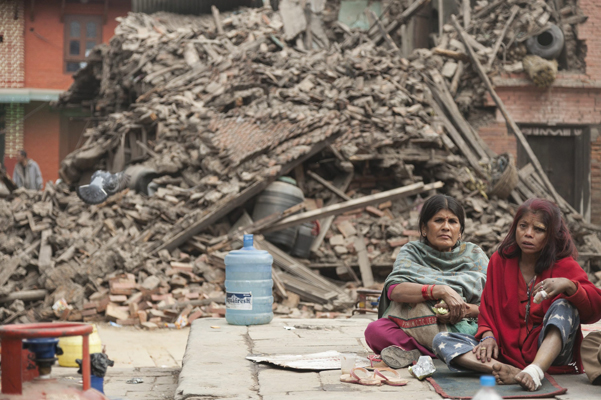 지진으로 폐허가 돼 버린 건물 앞에서 갈 곳을 잃은 주민들이 망연자실한 표정으로 앉아 있다.