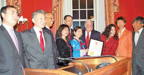 아태계 지도자들 떡-김치 들면서 덕담 래리 호건, 유미 호건 메릴랜드 주지사 부부가 26일 한인 등 아태계 지도자 200여명을 애나폴리스의 주지사 관저로 초청, 설을 축하했다. 호건 주지사는 이날“나는 한국인의 사위이자, 아시안의 사위”라며“설을 진심으로 축하한다”고 말했다. 이날 참석한 한국, 중국, 베트남계는 주지사실에서 준비한 떡과 김치 등 한국음식을 즐기며 덕담을 나눴다. 이날 행사에는 강도호 총영사, 장동원 메릴랜드한인회장, 본보 이양호 사장 등 100여명의 한인들이 참석했다. 호건 주지사가 한인과 아시아계 대표들에게 설 선포문을 전달하고 있다.