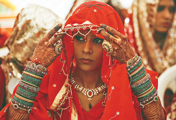 11일 인도 아마다바드에서 열리는 65쌍의 합동결혼식을 앞두고 어린 신부가 긴장을 감추고 베일을 가다듬고 있다.