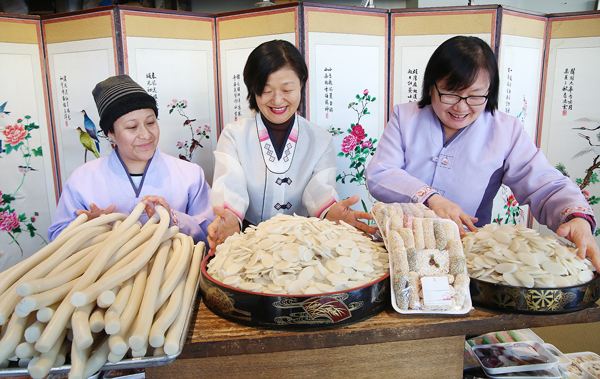 한민족 최대 고유 전통 명절인 설날(19일)을 앞두고 뉴욕과 뉴저지 일원의 한인 가정과 업소 마다 '설맞이'에 한창이다. 17일 퀸즈 플러싱 소재 하은희의 낙원잔치집 직원들이 곱게 한복을 차려입고 '설 떡국'에 쓰일 가래떡을 준비하며 담소를 나누고 있다.