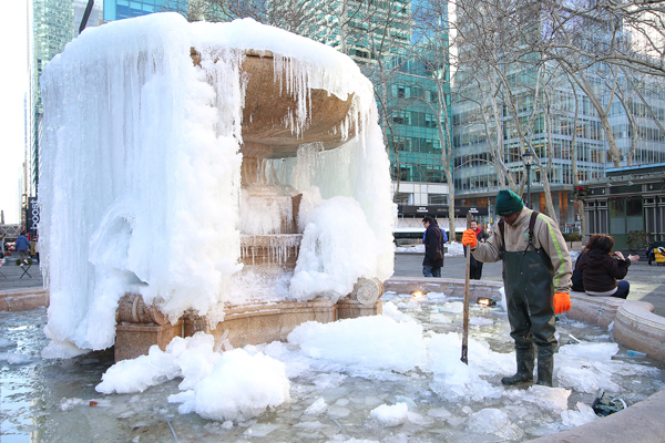 뉴욕 일원에 연일 몰아치는 한파가 주말동안 극에 달할 것으로 보인다. 13일 낮 최고기온 화씨 25도(섭씨 영하 4도), 밤 최저기온 화씨 12도(영하 11도)까지 떨어뜨린 이번 한파는 15일 최저기온을 화씨 1도(섭씨 영하 17도)까지 끌어내릴 것으로 예측됐다. 밸러타인스데이인 14일 오후부터는 약 1인치의 눈도 내릴 전망이다. 13일 맨하탄 브라이언트팍에서 공원국 직원이 꽁꽁 얼어붙은 분수를 깨트리고 있다.