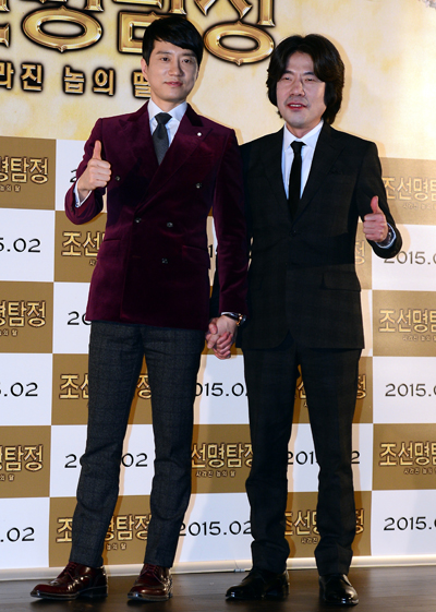 2일 오후 서울 중구 동대문 메가박스에서 열린 영화 '조선 명탐정:사라진 놉의 딸' 언론시사회에서 배우 김명민(왼쪽)·오달수가 포즈를 취하고 있다.