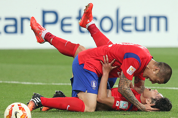 한국 대표팀이 22일 AFC 아시안컵 8강전 우즈베키스탄 경기에서 손흥민(아래쪽)이 연장 후반 두 번째 골을 성공시킨 뒤 그라운드에 쓰러져 차두리의 축하를 받고 있다.