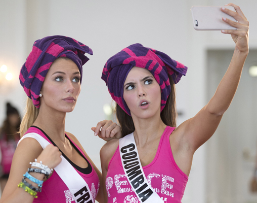 오는 25일 마이애미에서 열리는 미스 유니버스 대회에 출전하는 미스 이탈리아, 미스 자메이카, 미스 이스라엘 미인들이 14일 도랄 리조트 수영장에서 음악에 맞춰 춤을 추고 있다.