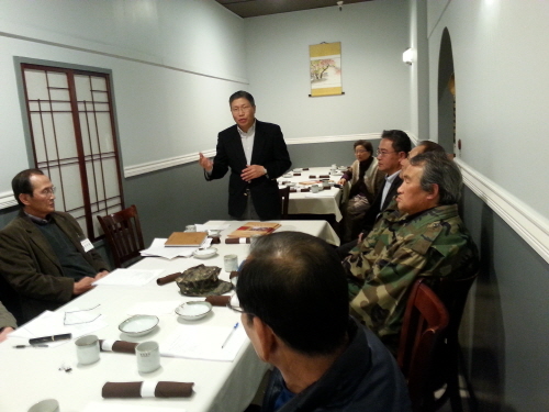 북가주 월남참전 전우회(회장 김정수)가 지난 10일 산타클라라 소재 한성갈비에서 임원 17명과 한동만 SF총영사, 정윤호 부총영사 등이 참석한 가운데 신년하례식을 가졌다. 한동만 총영사는 이날 대북정책과 통일한국시대를 준비하는 전우회의 역할을 당부했다. 이어진 회의에서는 전우회가 펼쳐나갈 2015년도 사업계획을 논의하는 시간을 가졌다. 한동만 총영사가 신년인사를 하고 있다.