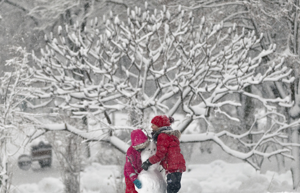 루마니아 부쿠레슈티의 한 공원에서 어린이들이 눈사람을 만들고 있다.
