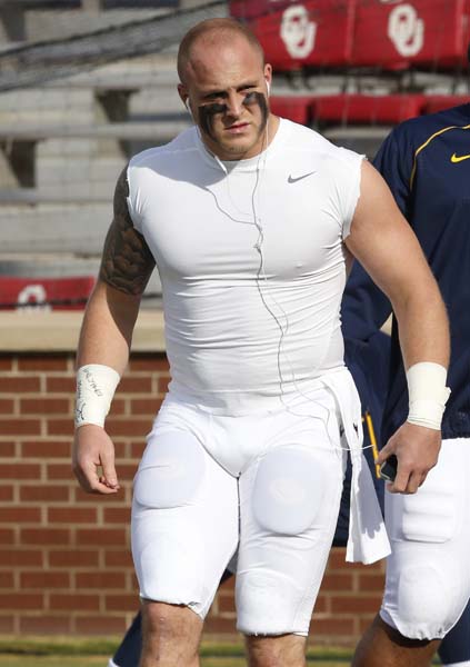웨스트버지니아 마운틴니어 라인벡커 제어드 바버가 3일 오클라호마 노만에서 열린 웨스트버지니아와 오클라호마와의 대학풋볼 경기에 앞서 근육질 몸매를 뽐내듯 상체가 드러나는 운동복을 입고 몸을 풀고 있다.
