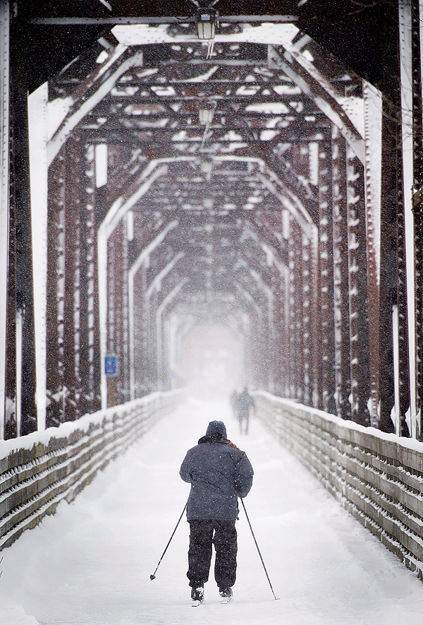 19일 15~20cm의 눈과 얼음비의 겨울폭풍이 휘몰아친 캐나다 뉴브런스윅주 프레드릭턴의 보행다리에서 한 남성이 스키를 타고 있다.