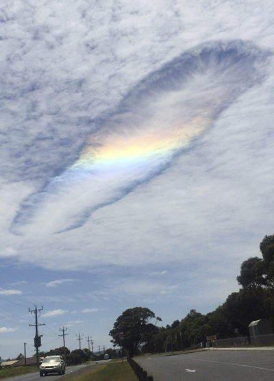스마트폰으로 찍은 사진으로 3일 호주 완타기 상공 위로 희귀한 구름 띠가 형성돼 눈길을 끌고 있다. 구름 내 얼음 결정체가 뭉쳐 구름에서 떨어져 나오면서 생기는 띠 현상이다.
