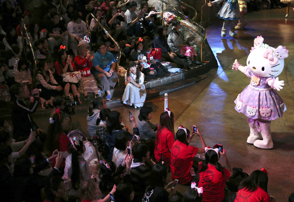 1일 탄생 40주년을 맞이한 ‘귀여운 고양이’ 헬로 키티가 도쿄 산리오 퓨로랜드 놀이공원에서 축하행사를 펼치고 있다.