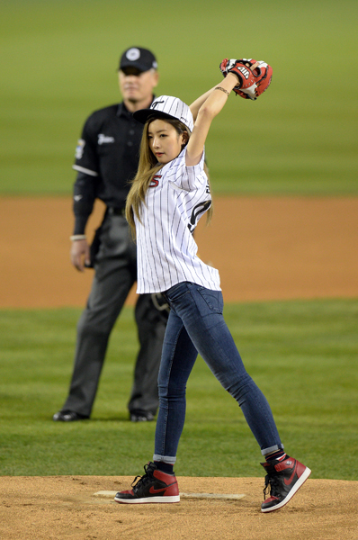 30일 오후 서울 송파구 잠실야구장에서 열린 ‘2014 프로야구’ 플레이오프 넥센 히어로즈와 LG 트윈스의 3차전 경기에서 에이핑크 윤보미가 머리를 휘날리며 시구를 하고 있다.