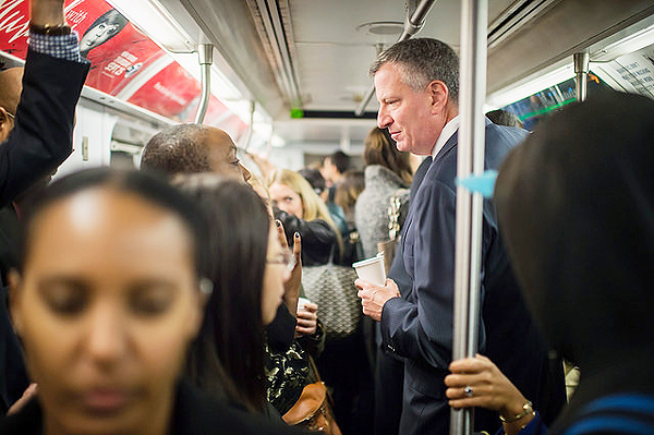 빌 드 블라지오 뉴욕시장이 에볼라 환자가 발생한 다음날인 24일 오전 맨하탄 전철에 탑승해 시민들을 안심시키고 있다.