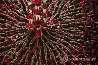 스페인 전통 카탈루냐 '인간 탑 쌓기' Spain Human Tower Members of the Castellers Joves Xiquets de Valls try to complete their human tower during the 25th Human Tower Competition in Tarragona, Spain, on Sunday, Oct. 5, 2014. The tradition of building human towers or “castells” dates back to the 18th century and takes place during festivals in Catalonia, where “colles” or teams compete to build the tallest and most complicated towers. The structure of the “castells” varies depending on their complexity. A “castell” is considered completely successful when it is loaded and unloaded without falling apart. The highest “castell” in history was a 10 floor structure with 3 people in each floor. In 2010 “castells” were declared by UNESCO one of the Masterpieces of the Oral and Intangible Heritage of Humanity.