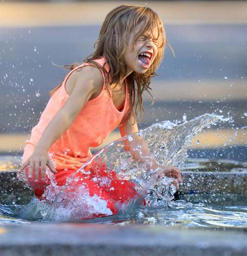 땡볕 더위가 기승을 부리는 캘리포니아 필스버그의 한 상가 분수대에서 5세난 여자 어린이가 물장구를 치며 놀고 있다.