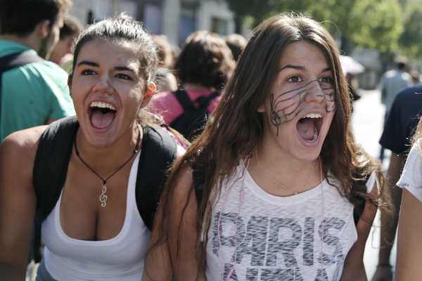 그리스 아테네 중심가에서 2일 음악대학 학생들이 교육 버짓에 항의하며 시위를 벌이고 있다.