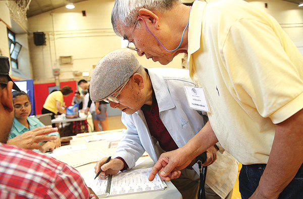 9일 플러싱 JHS189 중학교에 마련된 투표소를 찾은 김인수(90·오른쪽 두 번째) 옹이 투표에 앞서 한인통역관의 도움을 받으며 명부를 확인하고 있다.