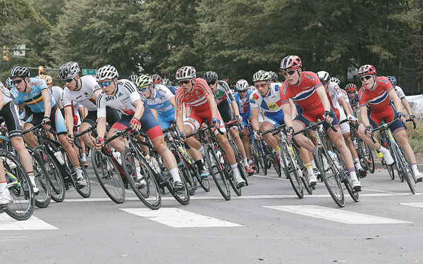 UCI 도로 사이클 세계 챔피언십 남성 23세 미만 부문 참가 선수들이 버지니아 리치몬드의 도소 사이클코스를 회전하고 있다.