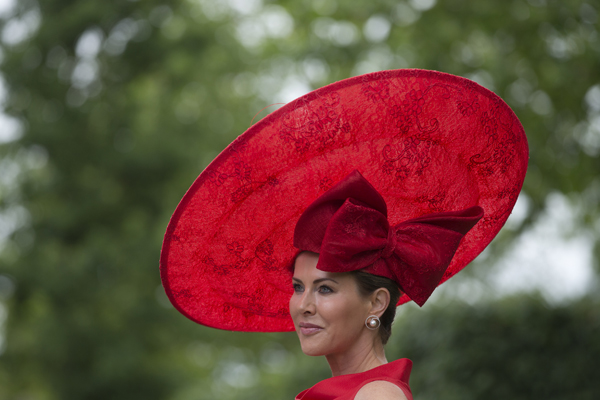 런던에서 열린 로열 에스콧 경마대회에서 한 여성이 멋진 모자를 쓰고 경마장에 들어서고 있다.