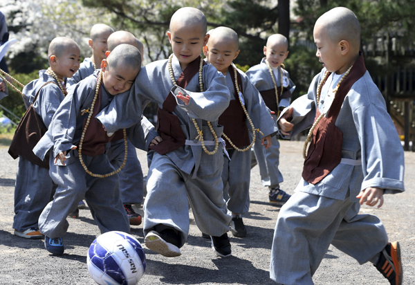 한국 제주도에 있는 한 사찰 경내에서 2일 동자승들이 축구를 하고 있다. 5월6일이 부처님오신날이다.