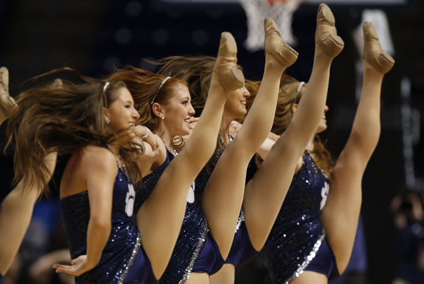 펜실베니아 스테이트 칼리지에서 25일 열린 NCAA 대학 농구토너먼트 펜스테이트와 플로리다와의 경기에서 치어리더들이 춤을 추며 선수들을 격려하고 있다.