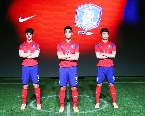2014 브라질 월드컵에 출전하는 한국 축구대표팀의 유니폼이 공개됐다. 27일(한국시간) 서울 광화문광장 특설무대에서 공개된 대표팀 유니폼은 전통적으로 이어온 강렬한 붉은색 상의와 짙은 파란색 하의로 음양의 조화를 나타낸 태극문양을 역동적으로 표현한 것으로 세계적 스포츠 용품업체 나이키가 제작했다. 이날 행사에서 20세 이하 청소년대표 선수들이 새 유니폼을 입고 포즈를 취하고 있다.