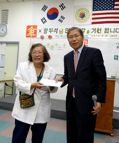 한동만 SF총영사는 19일 이스트베이한미노인봉사회(회장 김옥련)을 방문하고 회원들에게 급식봉사를 한 후 정치력신장활동 지원금을 전달했다. EB노인회는 시민권 취득, 유권자 등록 등 한인들의 투표독려활동을 펼칠 계획이다. 후원금을 받고 있는 김옥련 회장(왼쪽)과 한동만 총영사.