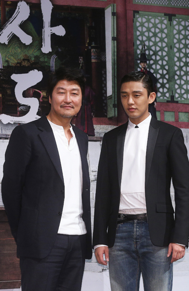 11일 오전 서울 강남구 신사동 CGV 압구정에서 열린 영화 ‘사도’ 제작보고회에서 영조 역을 맡은 송강호(왼쪽)와 사도세자 역을 맡은 유아인이 포즈를 취하고 있다.
