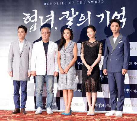 5일 오후 서울 광진구 롯데시네마 건대 입구점에서 열린 영화 ‘협녀, 칼의 기억’(감독 박흥식) 언론시사회에서 출연 배우들이 포토타임을 갖고 있다. 왼쪽부터 김영민, 이경영, 전도연, 김고은, 배수빈.
