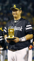 일본 프로야구 소프트뱅크의 이대호가 29일(현지시간) 일본 도쿄 메이지 진구구장에서 열린 야쿠르트 스왈로스와의 일본프로야구 일본시리즈(7전 4승제) 5차전 방문경기에서 승리하며 시리즈 우승을 차지한 뒤 시상식에서 MVP 트로피를 들고 기념촬영을 하고 있다. 이대호는 이날 4번 타자 1루수로 선발 출전, 선제 투런 홈런을 포함해 3타수 1안타 1볼넷 2타점에 한 차례 몸에 맞는 공을 얻어내 5-0 승리에 결정적인 역할을 했다.